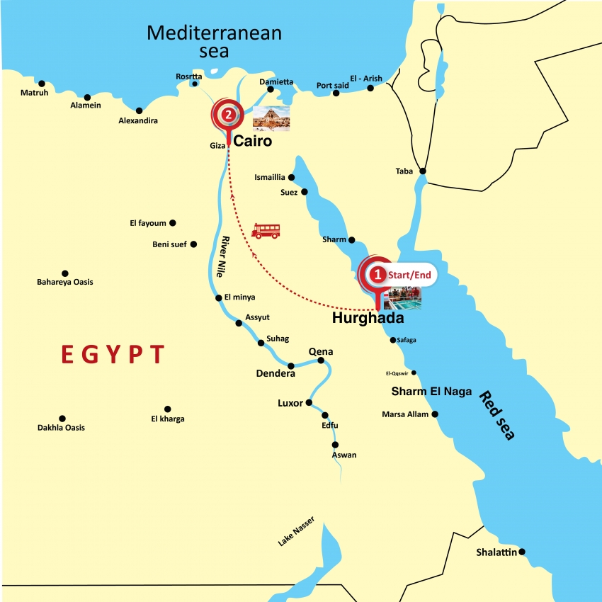 Tour Egypt Travel® representative will pick you up from your hotel in Hurghada or El Gouna to Cairo by a luxury air-condition vehicle drive for approximately 7 hours with one stop in the middle of the way, in case you need a rest. Discover the pyramids of Cheops, Chephren and Mykerinus, then proceed to visit the Great Sphinx of Giza, the head of a pharaoh with a lion's body guarding the Pyramid of Khafra (also known as Khefren or Chephren). This full day tour includes a visit o the Valley Temple that lies beside Sphinx. Lunch will be served in a local air-condition Egyptian restaurant. Continue to the visit the Egyptian Museum to gawk at the widest range of pharaonic masterpieces in the world.