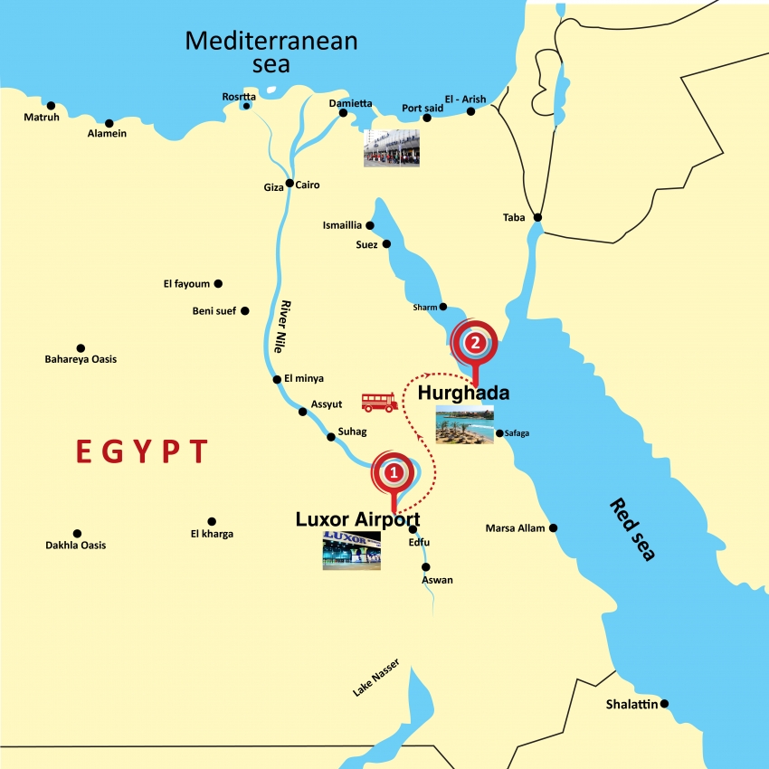 Tour Egypt Travel representative will pick you up from Luxor Airport to avoid the hussel of the Taxi drivers, then drive by our air-conditioned modern vehicle to Hurghada, our representative will offer you different activities & tours where you can enjoy in Hurghada, moreover we will offer you one bottle of Mineral water to each person free of charge, you will be most welcome